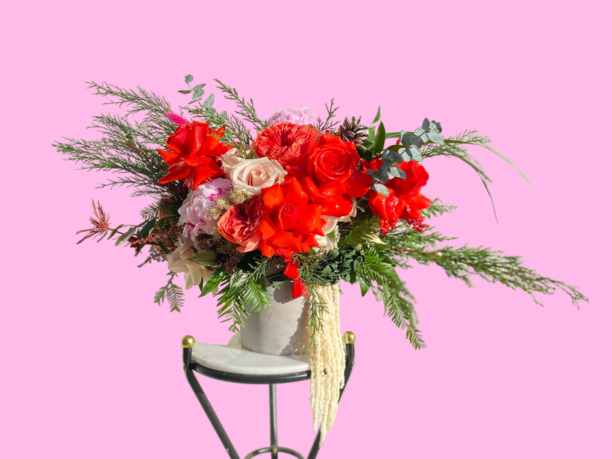 Seasonal arrangement with Vibrant Reds and whimsical touches.